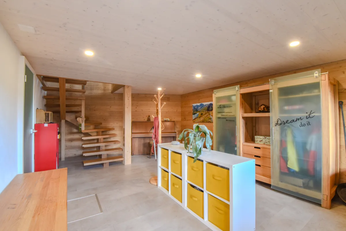 Le rez-inférieur comprend un grand local disponible, une deuxième entrée, une salle de douche avec WC. Cet espace étant équipé, il serait possible (sur autorisation) d’y aménager un studio indépendant (rendement possible).